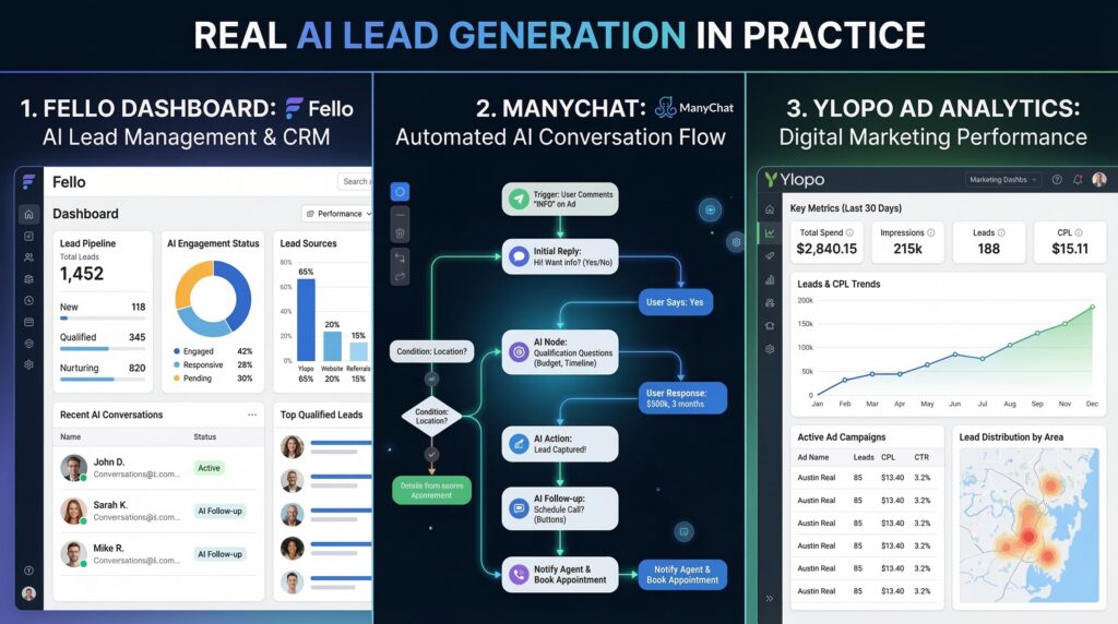 Tools like Fello mine your existing CRM for hidden seller opportunities. Ylopo deploys AI-powered Facebook/Google ads. ManyChat converts Instagram comments into leads automatically. When combined with n8n automation and AI caller agents, lead response time drops from hours to seconds.